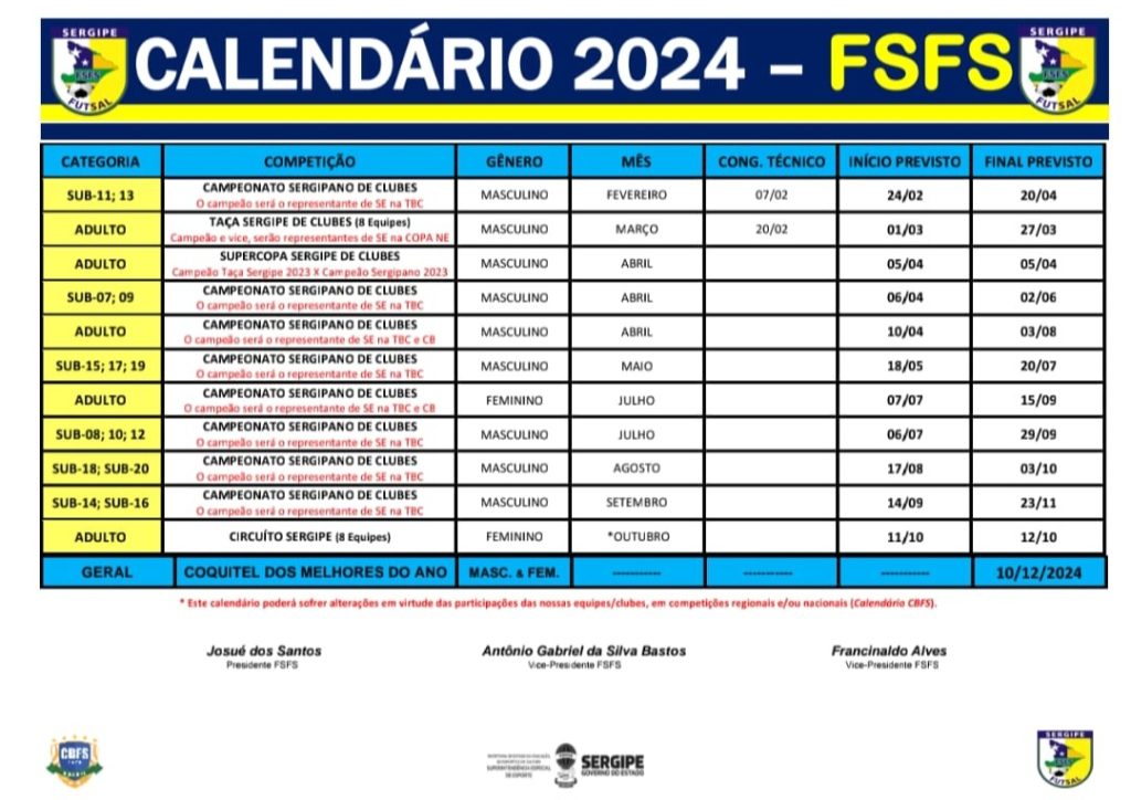 A Federação Sergipana de Futsal (FSFS) torna público o calendário do futsal sergipano para a imprensa e os amantes da bola pesada. Serão 19 competições, entre elas o Sergipão Sub-7 a Adulto (Masculino e Feminino), Taça Sergipe de Clubes Masculino, Supercopa Sergipe de Clubes Masculino e Circuito Sergipe Feminino.