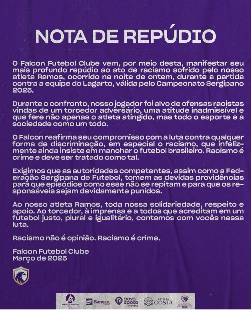 O Falcon Futebol Clube emitiu uma nota oficial de repúdio após seu atleta Ramos ter sido vítima de ofensas racistas durante a partida contra o Lagarto, válida pelo Campeonato Sergipano 2025. O incidente ocorreu na noite da última quarta-feira, mesmo jogo em que o Falcon venceu nos pênaltis e garantiu vaga nas semifinais do estadual.