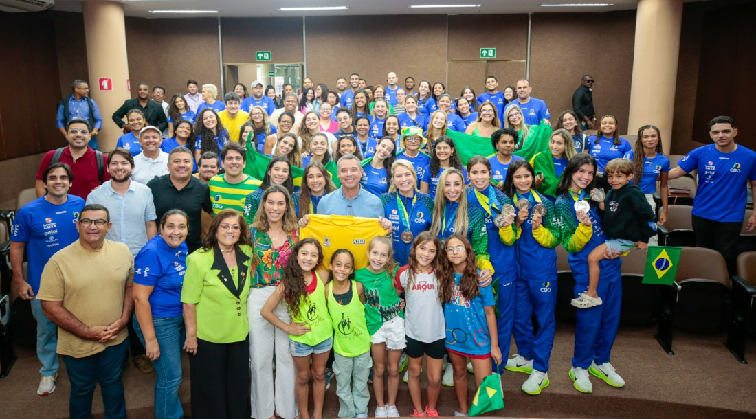 O governador Fábio Mitidieri recebeu, nesta segunda-feira, 1º, no Palácio dos Despachos, as atletas brasileiras medalhistas do Mundial de Ginástica Rítmica Rio 2025, que treinam no Centro Nacional de Treinamento da Ginástica Rítmica, em Aracaju. As duas medalhas de prata garantiram o pódio da modalidade de conjunto pela primeira vez na história da Ginástica brasileira. O Mundial aconteceu de 20 a 24 de agosto, no Parque Olímpico, na capital do Rio de Janeiro.
