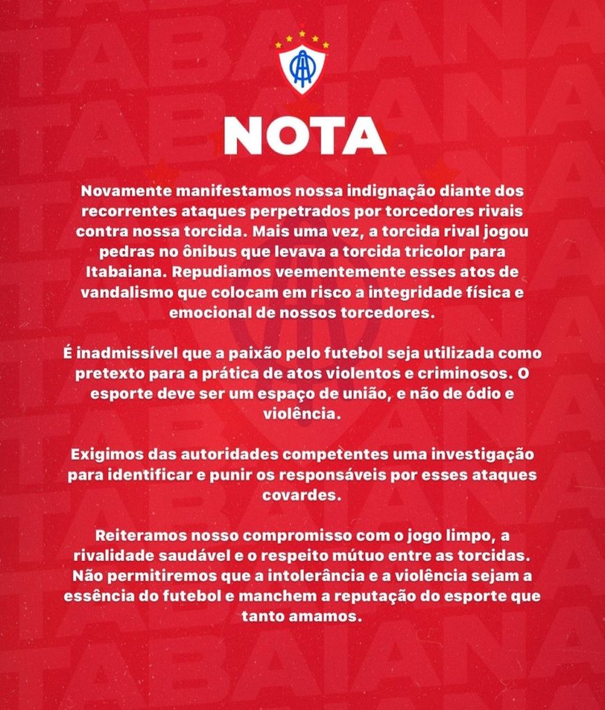 O Itabaiana reforçou o papel do esporte como um espaço de união e condenou veementemente o ódio e a violência presentes nesses acontecimentos. A diretoria exigiu das autoridades competentes uma investigação para identificar e punir os responsáveis por esses ataques covardes.